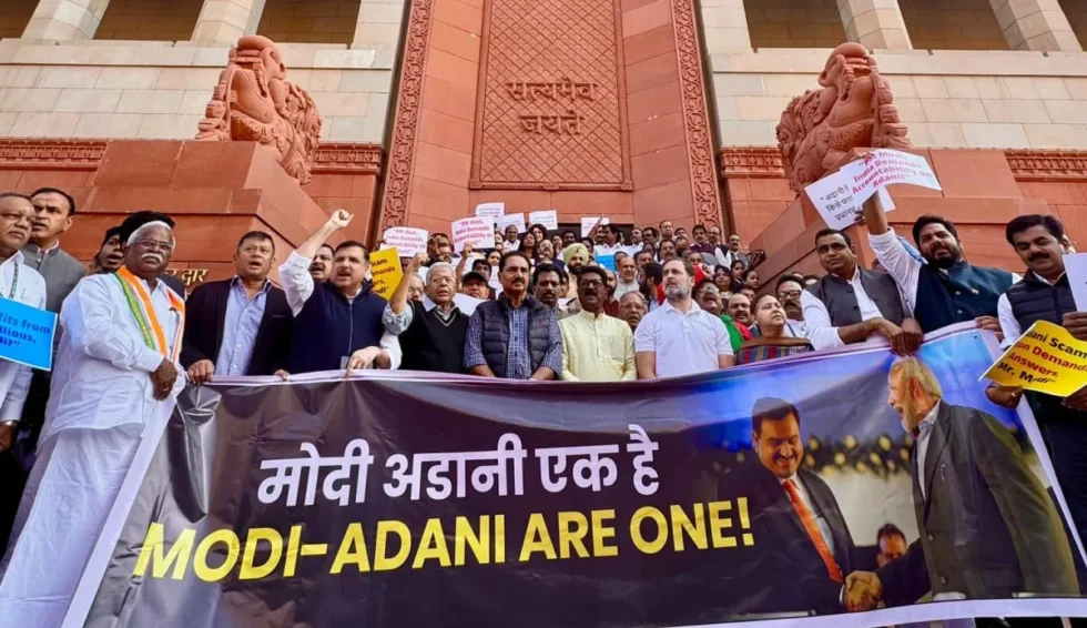 ਲੋਕ ਸਭਾ ਐਲਓਪੀ ਰਾਹੁਲ ਗਾਂਧੀ, ਕਾਂਗਰਸ ਸੰਸਦ ਮੈਂਬਰ ਪ੍ਰਿਅੰਕਾ ਗਾਂਧੀ ਵਾਡਰਾ, ‘ਆਪ’ ਸੰਸਦ ਮੈਂਬਰ ਸੰਜੇ ਸਿੰਘ ਅਤੇ ਭਾਰਤ ਬਲਾਕ ਦੇ ਹੋਰ ਨੇਤਾਵਾਂ ਨੇ ਮੰਗਲਵਾਰ ਨੂੰ ਅਡਾਨੀ ’ਤੇ ਲਗਾਏ ਦੋਸ਼ਾਂ ਦੇ ਮੁੱਦੇ ‘ਤੇ ਸੰਸਦ ਅੱਗੇ ਪ੍ਰਦਰਸ਼ਨ ਕੀਤਾ। ਇਸ ਮੌਕੇ ਉਨ੍ਹਾਂ ਬੈਨਰਾਂ ਨਾਲ ਪਰਦਰਸ਼ਨ ਕਰਦਿਆਂ ਅਡਾਨੀ ਦੋਸ਼ਾਂ ਦੀ ਸਾਂਝੀ ਸੰਸਦੀ ਕਮੇਟੀ (ਜੇਪੀਸੀ) ਤੋਂ ਜਾਂਚ ਦੀ ਮੰਗ ਕਰਦੇ ਹੋਏ ਕਈ ਨਾਅਰੇ ਲਗਾਏ।