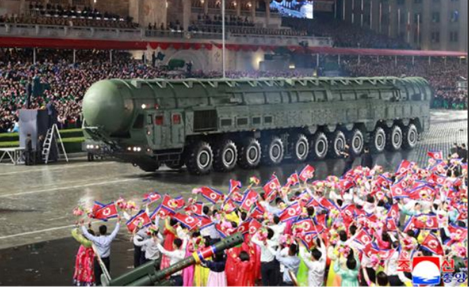 ਸਿਓਲ/ਏ.ਟੀ.ਨਿਊਜ਼: ਉੱਤਰੀ ਕੋਰੀਆ ਦੇ ਨੇਤਾ ਕਿਮ ਜੋਂਗ ਉਨ ਨੇ ਵਿਦੇਸ਼ੀ ਨੇਤਾਵਾਂ ਦੀ ਸ਼ਮੂਲੀਅਤ ਵਾਲੀ ਇੱਕ ਵਿਸ਼ਾਲ ਫ਼ੌਜੀ ਪਰੇਡ ’ਚ ਆਪਣੀ ਪ੍ਰਮਾਣੂ-ਹਥਿਆਰਬੰਦ ਫ਼ੌਜ ਦੇ ਸਭ ਤੋਂ ਸ਼ਕਤੀਸ਼ਾਲੀ ਹਥਿਆਰਾਂ, ਜਿਨ੍ਹਾਂ ਵਿਚ ਇਕ ਨਵੀਂ ਇੰਟਰਕੌਂਟੀਨੈਂਟਲ ਬੈਲਿਸਟਿਕ ਮਿਜ਼ਾਈਲ ਵੀ ਸ਼ਾਮਲ ਹੈ, ਦਾ ਪ੍ਰਦਰਸ਼ਨ ਕੀਤਾ। ਉੱਤਰੀ ਕੋਰੀਆ ਆਉਣ ਵਾਲੇ ਦਿਨਾਂ ਵਿੱਚ ਮਿਜ਼ਾਈਲ ਦਾ ਪ੍ਰੀਖਣ ਕਰਨ ਦੀ ਤਿਆਰੀ ਕਰ ਰਿਹਾ ਹੈ।
