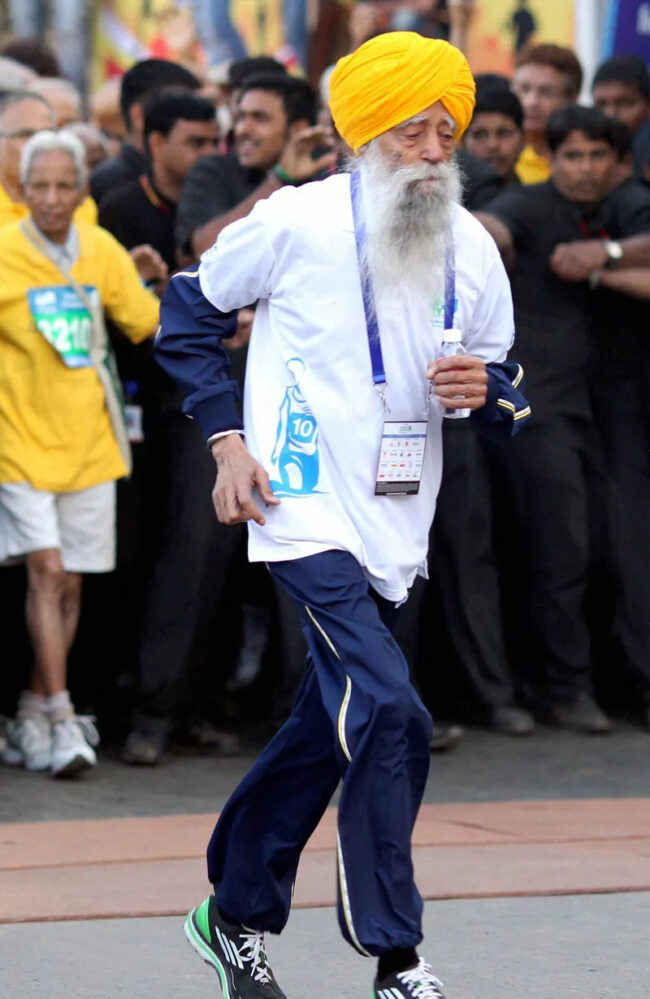 ਫ਼ੌਜਾ ਸਿੰਘ ਦੀ ਵਡਿਆਈ ਇਸ ਗੱਲ ’ਚ ਨਹੀਂ ਕਿ ਉਹ ਲੰਮੀਆਂ ਦੌੜਾਂ ਦੌੜਦਾ ਰਿਹਾ ਸਗੋਂ ਇਸ ਵਿੱਚ ਸੀ ਕਿ ਸੌ ਸਾਲਾਂ ਦਾ ਹੋ ਕੇ ਵੀ ਦੌੜੀ ਗਿਆ! 2000 ਵਿੱਚ ਲੰਡਨ ਦੀ ਫ਼ਲੋਰਾ ਮੈਰਾਥਨ ਲਾਉਂਦਿਆਂ ਉਹ 80 ਸਾਲ ਤੋਂ ਵਡੇਰੀ ਉਮਰ ਵਾਲਿਆਂ ਲਈ 6 ਘੰਟੇ 54 ਮਿੰਟ ਦਾ ਨਵਾਂ ਰਿਕਾਰਡ ਰੱਖ ਕੇ ਖ਼ਬਰਾਂ ਵਿੱਚ ਆਇਆ ਸੀ। ਉਦੋਂ ਪੱਗ ’ਤੇ ਖੰਡਾ ਲਾ ਕੇ ਝੂਲਦੀ ਦਾੜ੍ਹੀ ਨਾਲ ਦੌੜਦੇ ਫ਼ੌਜਾ ਸਿੰਘ ਦੀਆਂ ਤਸਵੀਰਾਂ ਲੰਡਨ ਦੀਆਂ ਸੜਕਾਂ ’ਤੇ ਲੱਗ ਗਈਆਂ ਸਨ। ਨਾਲ ਲਿਖਿਆ ਗਿਆ ਸੀ: ‘‘ਕੁਝ ਵੀ ਅਸੰਭਵ ਨਹੀਂ।’’ 2003 ਵਿੱਚ ਟੋਰਾਂਟੋ ’ਚ ਉਸ ਨੇ 42.2 ਕਿਲੋਮੀਟਰ ਦੀ ਦੌੜ 5 ਘੰਟੇ 40 ਮਿੰਟ 04 ਸਕਿੰਟ ਵਿੱਚ ਪੂਰੀ ਕੀਤੀ। 2004 ’ਚ ਟੋਰਾਂਟੋ ਦੀ ਹਾਫ਼ ਮੈਰਾਥਨ ਦੌੜਦਿਆਂ ਉਸ ਨੇ 2 ਘੰਟੇ 29.59 ਮਿੰਟ ਦਾ ਨਵਾਂ ਵਿਸ਼ਵ ਰਿਕਾਰਡ ਬਣਾਇਆ ਸੀ। 2012 ਵਿੱਚ ਉਹ ਆਖ਼ਰੀ ਮੈਰਾਥਨ ਦੌੜ ਹਾਂਗਕਾਂਗ ’ਚ ਦੌੜਿਆ ਤਾਂ ਚੈਰਿਟੀ ਲਈ 25,800 ਡਾਲਰ ’ਕੱਠੇ ਹੋਏ ਜੋ ਉਸ ਨੇ ਉੱਥੇ ਹੀ ਦਾਨ ਕਰ ਦਿੱਤੇ। ਉਸ ਨੇ ਲੰਡਨ ਦੀ ਮੈਰਾਥਨ ਵਿੱਚ 80 ਸਾਲ ਤੋਂ ਵੱਡੀ ਉਮਰ ਦੇ ਦੌੜਾਕਾਂ ’ਚ ਨਵਾਂ ਵਿਸ਼ਵ ਰਿਕਾਰਡ ਬਣਾ ਦਿੱਤਾ ਸੀ।ਬਾਬਾ ਫ਼ੌਜਾ ਸਿੰਘ ਨੇ ਦੌੜਾਂ ਦੇ ਅੰਤਰਰਾਸ਼ਟਰੀ ਮੁਕਾਬਲਿਆਂ ਵਿੱਚ ਅਨੇਕਾਂ ਵਿਸ਼ਵ ਰਿਕਾਰਡ ਬਣਾਏ ਸਨ, ਜਿਹਨਾਂ ਦੀ ਅਜੇ ਤੱਕ ਕੋਈ ਬਰਾਬਰੀ ਨਹੀਂ ਕਰ ਸਕਿਆ। ਉਹ ਵਿਸ਼ਵ ਦੇ ਬੱਚਿਆਂ ਤੋਂ ਲੈ ਕੇ ਨੌਜਵਾਨਾਂ ਅਤੇ ਬਜ਼ੁਰਗਾਂ ਲਈ ਪ੍ਰੇਰਨਾ ਸਰੋਤ ਸਨ, ਕਿਉਂਕਿ ਉਹ ਆਪਣੀ ਅੰਤਲੇ ਸਮੇਂ ਤੱਕ ਦੌੜਾਂ ਨਾਲ ਜੁੜੇ ਰਹੇ। ਉਹਨਾਂ ਨੇ ਆਪਣੀ ਜ਼ਿੰਦਗੀ ਵਿੱਚ ਕਦੇ ਹਾਰ ਨਹੀਂ ਮੰਨੀ ਅਤੇ ਹਰ ਦੌੜ ਵਿੱਚ ਉਹਨਾਂ ਨੇ ਆਪਣਾ ਪਹਿਲਾਂ ਨਾਲੋਂ ਵਧੀਆ ਪ੍ਰਦਰਸ਼ਨ ਕੀਤਾ। ਕਈ ਦੌੜਾਂ ਵਿੱਚ ਤਾਂ ਉਹਨਾਂ ਨੇ ਆਪਣੇ ਪਿਛਲੇ ਰਿਕਾਰਡ ਵੀ ਤੋੜੇ।