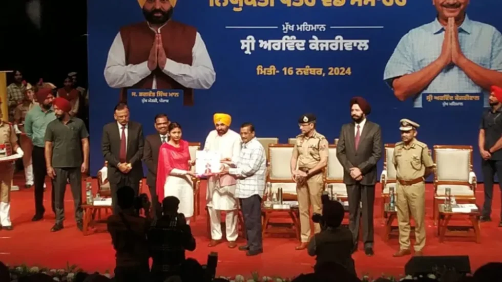 ਪੰਜਾਬ ਦੇ ਮੁੱਖ ਮੰਤਰੀ ਭਗਵੰਤ ਸਿੰਘ ਮਾਨ ਤੇ ਆਮ ਆਦਮੀ ਪਾਰਟੀ ਦੇ ਸੁਪਰੀਮੋ ਅਰਵਿੰਦ ਕੇਜਰੀਵਾਲ ਨੇ ਸ਼ਨਿੱਚਰਵਾਰ ਨੂੰ ਪੰਜਾਬ ਪੁਲੀਸ ਵਿੱਚ ਨਵ-ਨਿਯੁਕਤ 1205 ਕਾਂਸਟੇਬਲਾਂ ਨੂੰ ਨਿਯੁਕਤੀ ਪੱਤਰ ਸੌਂਪੇ। ਇਸ ਮੌਕੇ ਸ੍ਰੀ ਮਾਨ ਨੇ ਨਵ-ਨਿਯੁਕਤ ਕਾਂਸਟੇਬਲਾਂ ਨੂੰ ਇਮਾਨਦਾਰੀ ਨਾਲ ਲੋਕਾਂ ਦੀ ਸੇਵਾ ਕਰਨ ਦੀ ਅਪੀਲ ਕੀਤੀ।