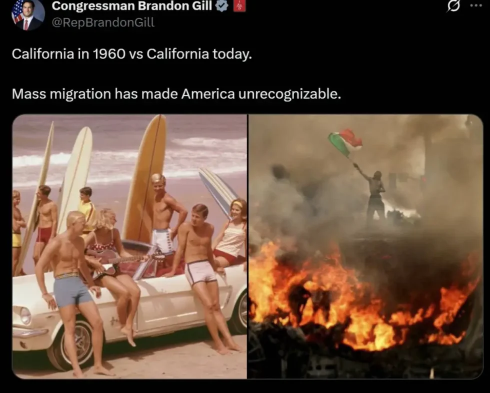 ਸੈਕਰਾਮੈਂਟੋ,ਕੈਲੀਫ਼ੋਰਨੀਆ/ ਹੁਸਨ ਲੜੋਆ ਬੰਗਾ: ਟੈਕਸਾਸ ਦੇ ਰਿਪਬਲੀਕਨ ਕਾਂਗਰਸ ਮੈਂਬਰ ਬਰੈਨਡਨ ਗਿੱਲ ਨੇ ਸੋਸ਼ਲ ਮੀਡੀਆ ੳੁੱਪਰ 1960 ਵਿਆਂ ਤੇ ਅੱਜ ਦਾ ਕੈਲੀਫ਼ੋਰਨੀਆ ਸਬੰਧੀ ਪੋਸਟ ਪਾ ਕੇ ਇਕ ਤਰ੍ਹਾਂ ਰਾਸ਼ਟਰਪਤੀ ਡੋਨਾਲਡ ਟਰੰਪ ਉੱਪਰ ਵਿਅੰਗ ਕੱਸਿਆ ਹੈ। ਗਿੱਲ, ਜੋ ਟੈਕਸਾਸ ਦੇ 26 ਵੇਂ ਡਿਸਟ੍ਰਿਕਟ ਦੀ ਪ੍ਰਤੀਨਿੱਧਤਾ ਕਰਦੇ ਹਨ, ਨੇ ਕੈਲੀਫ਼ੋਰਨੀਆ ਦੀਆਂ ਦੋ ਤਸਵੀਰਾਂ ਪਾ ਕੇ ਪੋਸਟ ਸਾਂਝੀ ਕੀਤੀ ਹੈ। ਇੱਕ ਤਸਵੀਰ 1960ਵਿਆਂ ਦੀ ਇੱਕ ਸ਼ਾਂਤ ਬੀਚ ਦੀ ਹੈ ਜਿਸ ਵਿੱਚ ਅਮਰੀਕੀ ਲੋਕ ਧੁੱਪ ਦਾ ਆਨੰਦ ਮਾਣ ਰਹੇ ਹਨ ਤੇ ਦੂਸਰੀ ਤਸਵੀਰ ਅੱਜ ਦੇ ਕੈਲੀਫ਼ੋਰਨੀਆ ਦੀ ਹੈ ਜਿਸ ਵਿੱਚ ਕੈਲੀਫ਼ੋਰਨੀਆ ਸੜ ਰਿਹਾ ਹੈ ਤੇ ਇੱਕ ਵਿਅਕਤੀ ਮੈਕਸੀਕੀਅਨ ਝੰਡਾ ਲਹਿਰਾ ਰਿਹਾ ਹੈ। ਗਿੱਲ ਨੇ ਇਸ ਪੋਸਟ ਵਿੱਚ ਵਿਆਪਕ ਪਰਵਾਸ ਦਾ ਸੁਨੇਹਾ ਦਿੱਤਾ ਹੈ ਜਿਸ ਕਾਰਨ ਅਮਰੀਕੀ ਸਮਾਜ ਨਿਵਾਨਾਂ ਵੱਲ ਜਾ ਰਿਹਾ ਹੈ। ਗਿੱਲ ਨੇ ਕਿਹਾ ਹੈ ਸਮੂਹਿਕ ਪਰਵਾਸ ਨੇ ਅਮਰੀਕਾ ਦੀ ਪਛਾਣ ਨਹੀਂ ਰਹਿਣ ਦਿੱਤੀ।