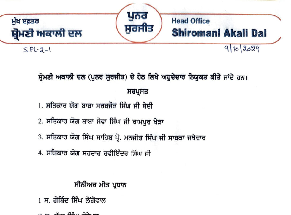 ਚੰਡੀਗੜ੍ਹ/ਏ.ਟੀ.ਨਿਊਜ਼: ਸ਼੍ਰੋਮਣੀ ਅਕਾਲੀ ਦਲ (ਪੁਨਰ ਸੁਰਜੀਤ ) ਵੱਲੋਂ ਨਵੇਂ ਅਹੁਦੇਦਾਰਾਂ ਦੀ ਨਿਯੁਕਤੀ ਕੀਤੀ ਗਈ ਹੈ। ਇਸ ਸਬੰਧੀ ਜਾਣਕਾਰੀ ਦਿੰਦਿਆਂ ਸ਼੍ਰੋਮਣੀ ਅਕਾਲੀ ਦਲ (ਪੁਨਰ ਸੁਰਜੀਤ ) ਦੇ ਪ੍ਰਧਾਨ ਗਿਆਨੀ ਹਰਪ੍ਰੀਤ ਸਿੰਘ ਨੇ ਦਸਿਆ ਕਿ ਬਾਬਾ ਸਰਬਜੋਤ ਸਿੰਘ ਬੇਦੀ, ਬਾਬਾ ਸੇਵਾ ਸਿੰਘ ਰਾਮਪੁਰ ਖੇੜਾ,ਪ੍ਰੋ.ਮਨਜੀਤ ਸਿੰਘ ਸਾਬਕਾ ਜਥੇਦਾਰ, ਸ੍ਰ. ਰਵੀਇੰਦਰ ਸਿੰਘ ਨੂੰ ਸਰਪ੍ਰਸਤ, ਗੋਬਿੰਦ ਸਿੰਘ ਲੋਂਗੋਵਾਲ, ਸੁੱਚਾ ਸਿੰਘ ਛੋਟੇਪੁਰ, ਆਦੇਸ਼ਪ੍ਰਤਾਪ ਸਿੰਘ ਕੈਰੋਂ, ਮਨਪ੍ਰੀਤ ਸਿੰਘ ਇਆਲੀ, ਗਗਨਦੀਪ ਸਿੰਘ ਬਰਨਾਲਾ, ਇਕਬਾਲ ਸਿੰਘ ਝੂੰਦਾ, ਸੁਰਿੰਦਰ ਸਿੰਘ ਭੁੱਲੇਰਾਠਾਂ, ਭਾਈ ਮਨਜੀਤ ਸਿੰਘ ਨੂੰ ਸੀਨੀਅਰ ਮੀਤ ਪ੍ਰਧਾਨ, ਸੰਤਾ ਸਿੰਘ ਉਮੈਦਪੁਰ, ਸਰਵਨ ਸਿੰਘ ਫਿਲੌਰ, ਸਰਬਜੀਤ ਸਿੰਘ ਡੂੰਮਵਾਲੀ, ਮਹਿੰਦਰ ਸਿੰਘ ਹੁਸੈਨਪੁਰ, ਜਰਨੈਲ ਸਿੰਘ ਕਰਤਾਰਪੁਰ,ਪਰਮਜੀਤ ਕੌਰ ਗੁਲਸ਼ਨ, ਮਹਿੰਦਰਪਾਲ ਸਿੰਘ ਬਨਾਕਾ ਨੂੰ ਮੀਤ ਪ੍ਰਧਾਨ, ਗੁਰਪ੍ਰਤਾਪ ਸਿੰਘ ਵਡਾਲਾ ਨੂੰ ਸਕੱਤਰ ਜਨਰਲ, ਪਰਮਿੰਦਰ ਸਿੰਘ ਢੀਂਡਸਾ ਨੂੰ ਖਜਾਨਚੀ, ਬਰਜਿੰਦਰ ਸਿੰਘ ਬਰਾੜ ਮੋਗਾ, ਹਰਿੰਦਰਪਾਲ ਸਿੰਘ ਸਨੌਰ, ਬੀਬੀ ਕਿਰਨਜੋਤ ਕੌਰ, ਚਰਨਜੀਤ ਸਿੰਘ ਬਰਾੜ, ਜਸਵੀਰ ਸਿੰਘ ਘੁੰਮਣ, ਗੁਰਜੀਤ ਸਿੰਘ ਤਲਵੰਡੀ, ਯੁਵਰਾਜ ਸਿੰਘ, ਭਰਭੂਰ ਸਿੰਘ ਧਾਂਦਰਾ ਨੂੰ ਜਰਨਲ ਸਕੱਤਰ, ਗਿਆਨੀ ਮਹਿੰਦਰ ਸਿੰਘ ਹਿਮਾਚਲ ਪ੍ਰਦੇਸ, ਸਤਵਿੰਦਰ ਸਿੰਘ ਟੌਹੜਾ, ਸੁਖਵਿੰਦਰ ਸਿੰਘ ਔਲਖ,ਦਵਿੰਦਰ ਸਿੰਘ ਸੇਖੋਂ, ਕਰਨ ਸਿੰਘ ਡੀ.ਟੀ.ਓ., ਅਜੇਪਾਲ ਸਿੰਘ ਮੀਰਾਂਕੋਟ ਨੂੰ ਜਥੇਬੰਦਕ ਸਕੱਤਰ, ਪ੍ਰਕਾਸ਼ ਚੰਦ ਗਰਗ ਨੂੰ ਵਪਾਰ ਵਿੰਗ ਦਾ ਪ੍ਰਧਾਨ, ਕਪੂਰ ਚੰਦ ਬਾਂਸਲ ਨੂੰ ਵਪਾਰ ਵਿੰਗ ਦਾ ਸਕੱਤਰ ਨਿਯੁਕਤ ਕੀਤਾ ਗਿਆ ਹੈ।