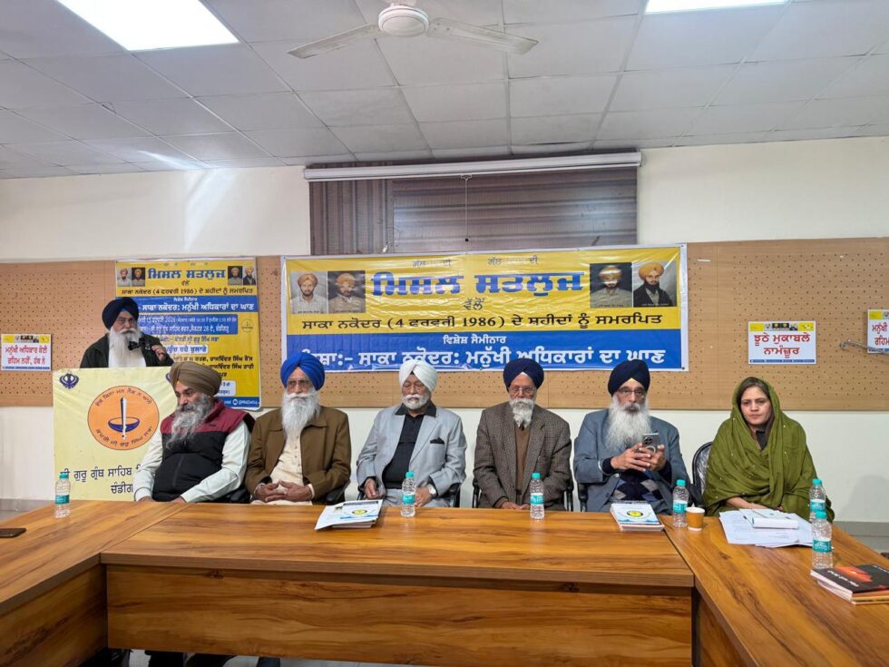 ਚੰਡੀਗੜ੍ਹ/ਏ.ਟੀ.ਨਿਊਜ਼: ਮਿਸਲ ਸਤਲੁਜ ਜਥੇਬੰਦੀ ਵੱਲੋਂ ਸਾਕਾ ਨਕੋਦਰ (4 ਫ਼ਰਵਰੀ 1986) ਦੇ ਸ਼ਹੀਦਾਂ ਦੀ ਯਾਦ ਵਿੱਚ ਲੰਘੇ ਦਿਨੀਂ ਸ੍ਰੀ ਗੁਰੂ ਗ੍ਰੰਥ ਸਾਹਿਬ ਭਵਨ, ਸੈਕਟਰ-28, ਚੰਡੀਗੜ੍ਹ ਵਿਖੇ ਵਿਸ਼ੇਸ਼ ਸੈਮੀਨਾਰ ਆਯੋਜਿਤ ਕੀਤਾ ਗਿਆ। ਸੈਮੀਨਾਰ ਦਾ ਵਿਸ਼ਾ “ਸਾਕਾ ਨਕੋਦਰ: ਮਨੁੱਖੀ ਅਧਿਕਾਰਾਂ ਦਾ ਘਾਣ” ਰਿਹਾ। ਇਸ ਮੌਕੇ ਕਾਨੂੰਨ ਵਿਦਵਾਨਾਂ, ਵਿਦਿਆਰਥੀਆਂ ਅਤੇ ਬੁੱਧੀਜੀਵੀਆਂ ਨੇ ਵੱਡੀ ਗਿਣਤੀ ਵਿੱਚ ਸ਼ਮੂਲੀਅਤ ਕੀਤੀ।