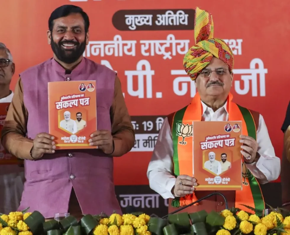 ਭਾਰਤੀ ਜਨਤਾ ਪਾਰਟੀ ਨੇ ਹਰਿਆਣਾ ਵਿਧਾਨ ਸਭਾ ਚੋਣਾਂ ਲਈ ਵੀਰਵਾਰ ਨੂੰ ਇਥੇ ਆਪਣਾ ਚੋਣ ਮਨੋਰਥ ਪੱਤਰ ਜਾਰੀ ਕਰਦਿਆਂ ਔਰਤਾਂ ਨੂੰ ‘ਲਾਡੋ ਲਕਸ਼ਮੀ ਯੋਜਨਾ’ ਤਹਿਤ ਹਰ ਮਹੀਨੇ 2100 ਰੁਪਏ ਨਕਦ ਉਤਸ਼ਾਹ ਰਾਸ਼ੀ ਦੇਣ, ਸਾਰੀਆਂ 24 ਫ਼ਸਲਾਂ ਲਈ ਐੱਮਐੱਸਪੀ ਨੂੰ ਜਾਰੀ ਰੱਖਣ ਅਤੇ ਅਗਨੀਵੀਰਾਂ ਨੂੰ ਰੁਜ਼ਗਾਰ ਗਾਰੰਟੀ ਦੇਣ ਦੇ ਨਾਲ ਹੀ ਨੌਜਵਾਨਾਂ ਲਈ ਦੋ ਲੱਖ ਨੌਕਰੀਆਂ ਦੇਣ ਦਾ ਵਾਅਦਾ ਕੀਤਾ ਹੈ। ਰਸੋਈ ਗੈਸ ਸਿਲੰਡਰ 500 ਰੁਪਏ ਵਿਚ ਦੇਣ ਤੇ ਪੇਂਡੂ ਖੇਤਰਾਂ ਦੀਆਂ ਵਿਦਿਆਰਥਣਾਂ ਨੂੰ ਸਕੂਟਰ ਦੇਣ ਦੀ ਗੱਲ ਵੀ ਕਹੀ ਗਈ ਹੈ।